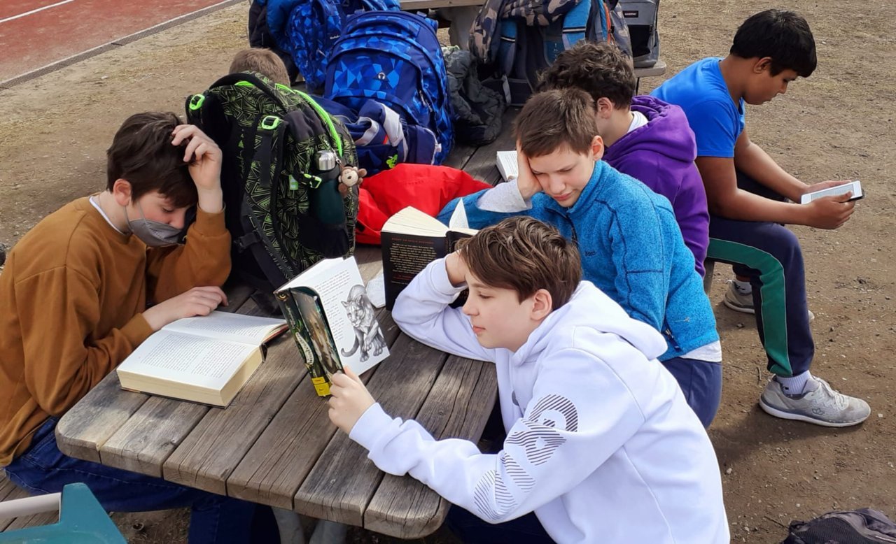 Die ganze Schule liest... in den Klassen, in der Bibliothek und im Garten.