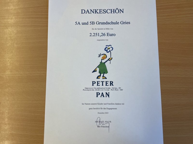 Als Dankeschön für das Engagement brachte eine Vertreterin von Peter Pan den Kindern eine Urkunde vorbei und bedankte sich herzlich bei den Kindern. Die Freude war groß, und alle waren stolz auf das, was sie gemeinsam geschafft haben. Die Kinder bekamen zudem Armbänder mit der Aufschrift: PETER PAN Insieme con coraggio! Gemeinsam stark!