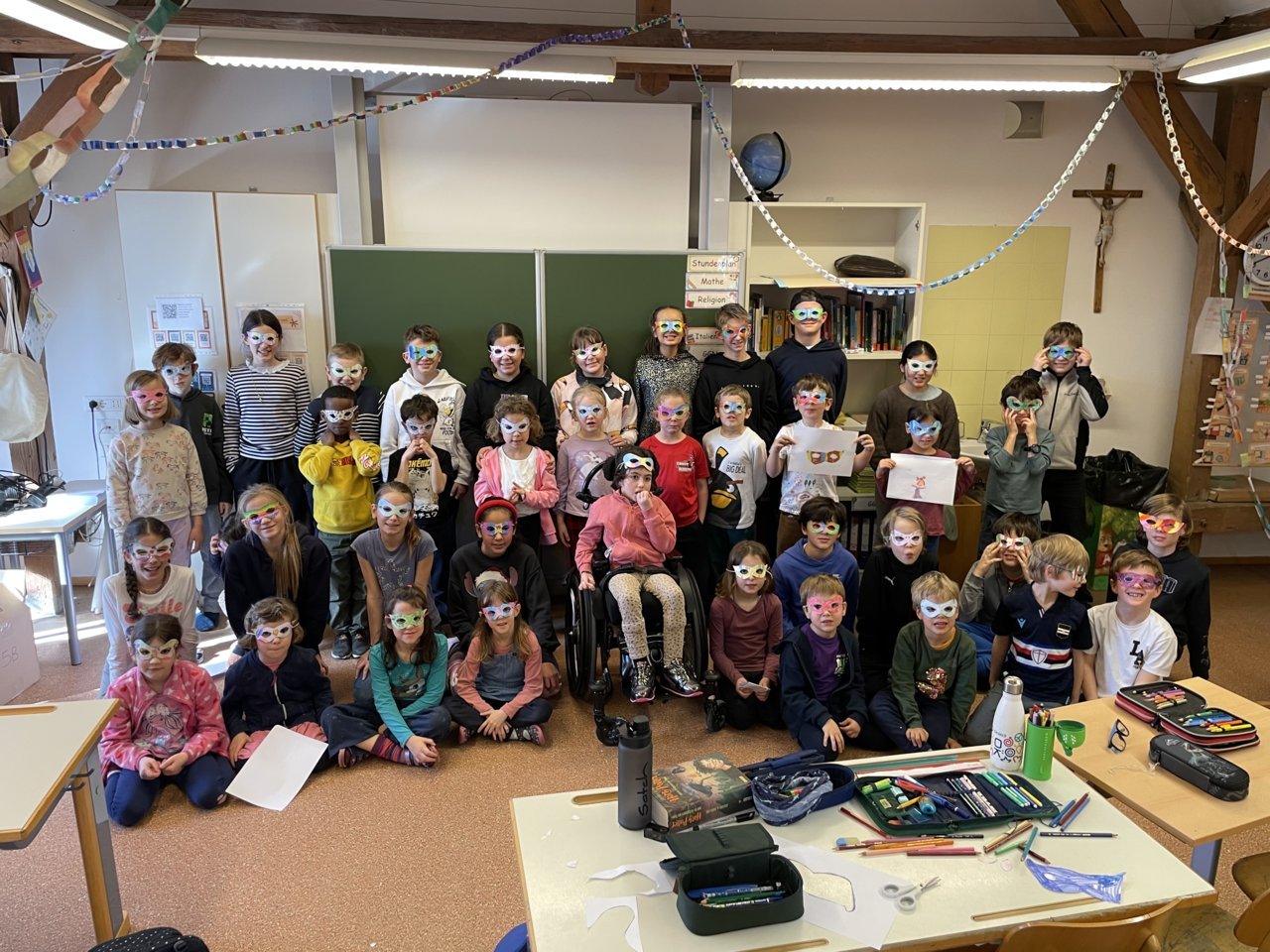 Besonders schön zu beobachten war, wie die Kinder zusammenarbeiteten. Viele kleine Gespräche, gemeinsame Entscheidungen über Farben und Muster und gegenseitiges Helfen machten die Bastelzeit zu einem harmonischen Erlebnis. Am Ende entstanden farbenfrohe und sehr individuelle Kunstwerke, die die Vorfreude auf die Faschingsferien noch einmal deutlich steigerten.